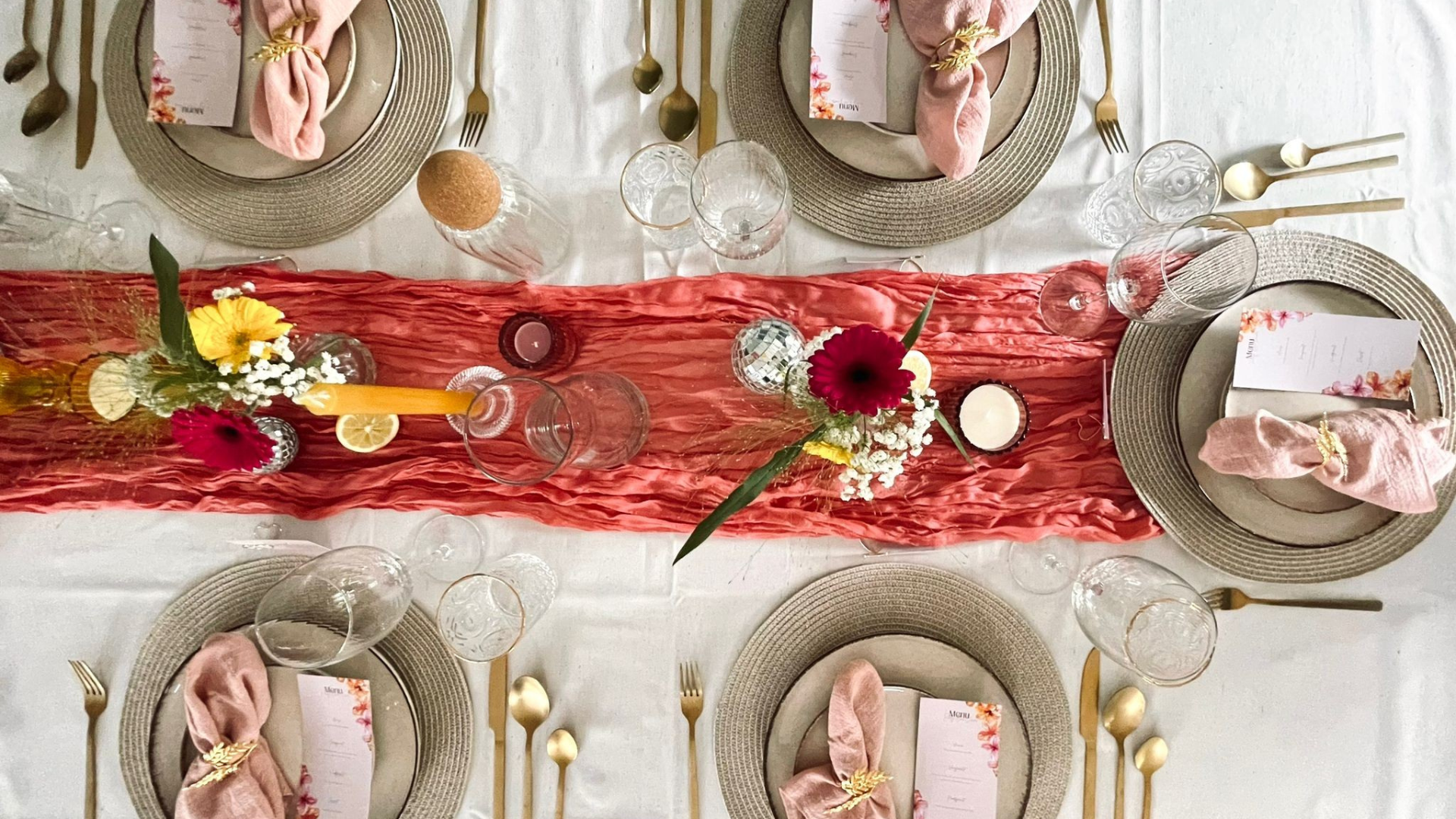 21- diner in het thema roze & geel. Roze is een van de meest gebruikte kleuren tijdens een 21-diner. Zo hebben we bij deze styling geel als tegen hangende kleur gebruikt. Contrast zorgt voor samenhang.